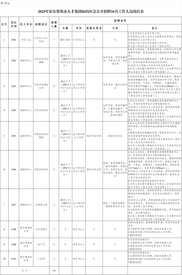 按需扫码下载附件1:2025年霍尔果斯市人才集团面向社会公开招聘16名工作人员岗位表: