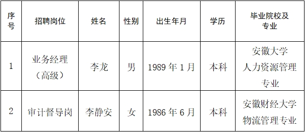 根据有关制度文件,经公司研究决定,拟录用以下人员,现将有关信息公示如下: