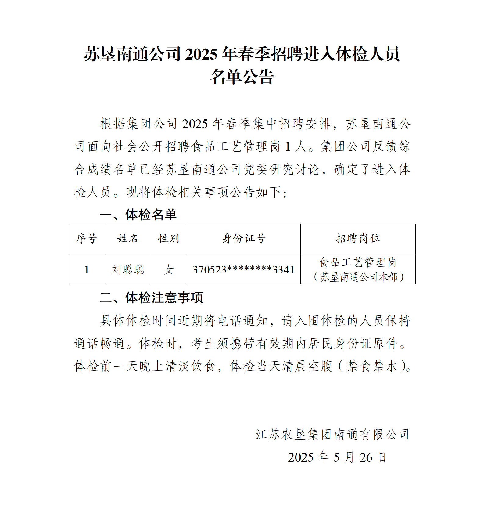 苏垦南通公司2025年春季招聘进入体检人员名单公告