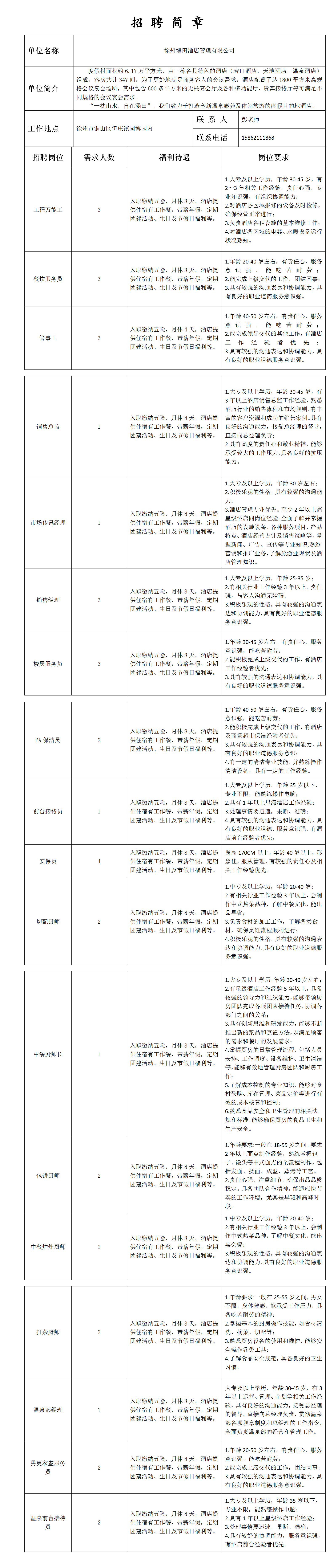 已结束 【合同制】徐州博田酒店管理有限公司招聘简章(招若干人,06月10日~06月25日报名)