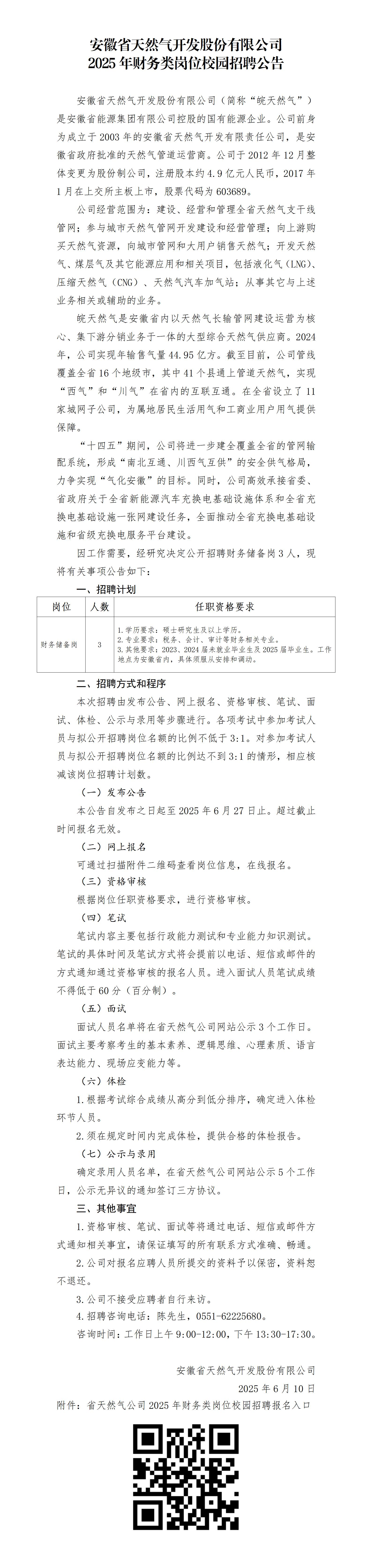 已结束 【合同制】安徽省天然气开发股份有限公司2025年财务类岗位校园招聘公告(招若干人,06月10日~06月25日报名)