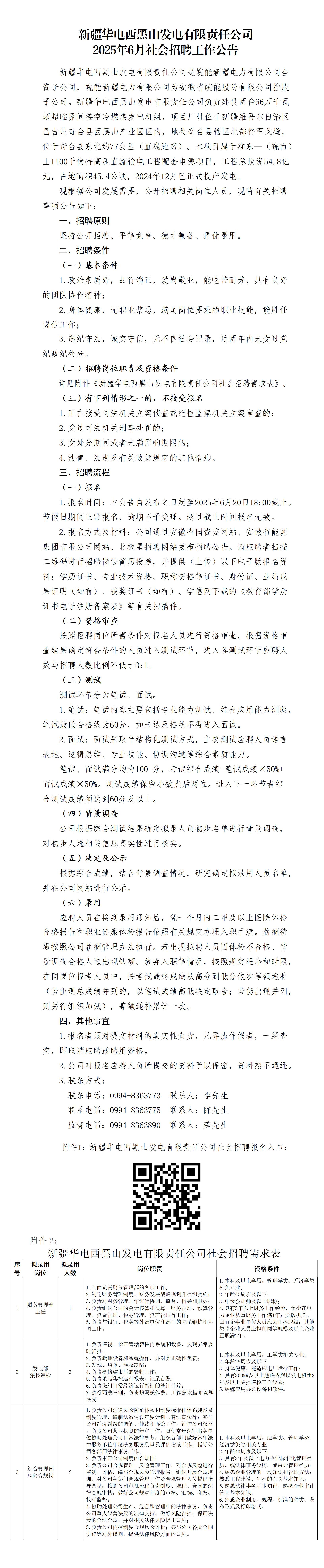 已结束 【合同制】新疆华电西黑山发电有限责任公司2025年6月社会招聘工作公告(招若干人,06月10日~06月25日报名)