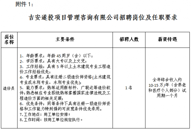 遂川县城控人力资源管理有限公司成立于2022年12月,是一家以人力资源管理为主的国有企业。因公司业务发展需要,特面向社会公开招聘1名造价员,现将有关事项公告如下: