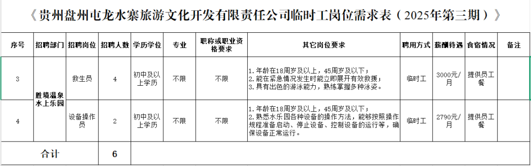 根据工作需要,本次面向社会公开招聘临时工6名,具体招聘岗位及要求详见《贵州盘州屯龙水寨旅游文化开发有限责任公司临时工岗位需求表(2025年第三期)》(附件1)。