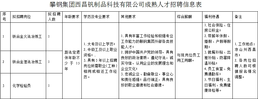 西昌钒制品通过官方网站、微信公众号、第三方引进机构等平台发布招聘信息,明确引进岗位、条件以及工作地点、薪酬福利等内容。
