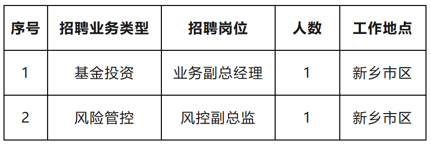 现根据公司业务发展和人才队伍建设需要,拟面向社会公开招聘业务副总经理、风控副总监各1名。具体公告如下: