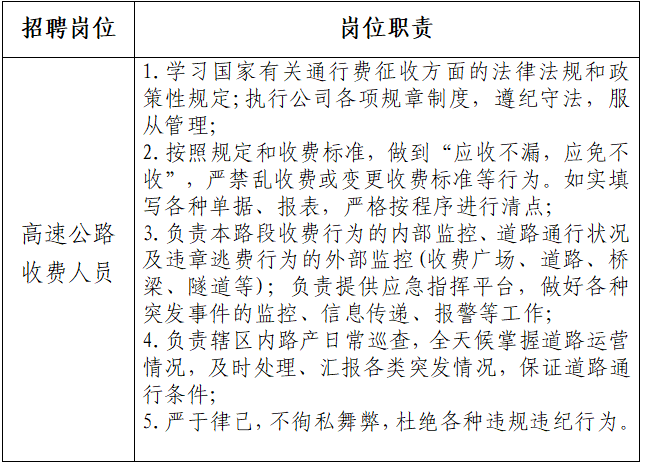 6.录用后经培训,能掌握高速公路通行费收费等相关业务,为通行车辆司乘人员提供优质服务;
