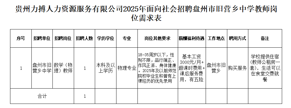 附件1:《贵州力搏人力资源服务有限公司2025年面向社会招聘盘州市旧营乡中学教师岗位需求表》