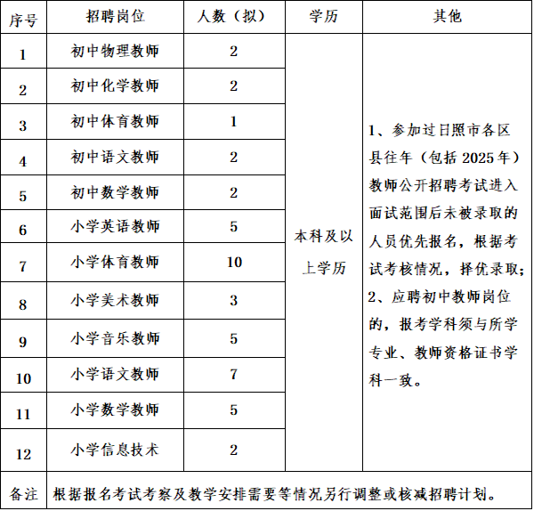 为进一步优化提升和满足公司驻政府购买人力资源服务外包项目工作需要,由山东杰出政务服务外包有限公司面向社会拟招聘部分中小学教师46名,参加过日照市各区县往年(包括2025年)教师公开招聘考试进入面试范围后未被录取的人员优先报名,择优录取,根据外包项目工作需要派驻到日照市部分公办学校工作。现就有关事项公告如下: