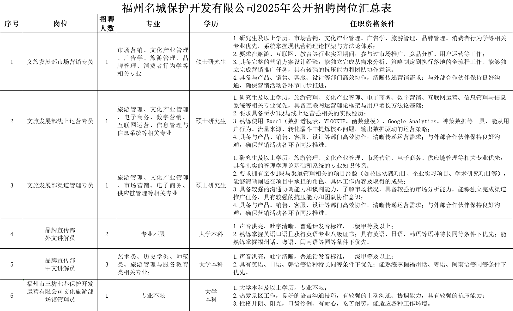 福州名城保护开发有限公司于2008年11月成立,注册资本金5000万,主营旅游产品销售、开发、包装,历史文化古街古镇保护、开发、管理,境内旅游服务,文化艺术品交流活动组织策划等业务。公司2025年第四次公开招聘公告如下: