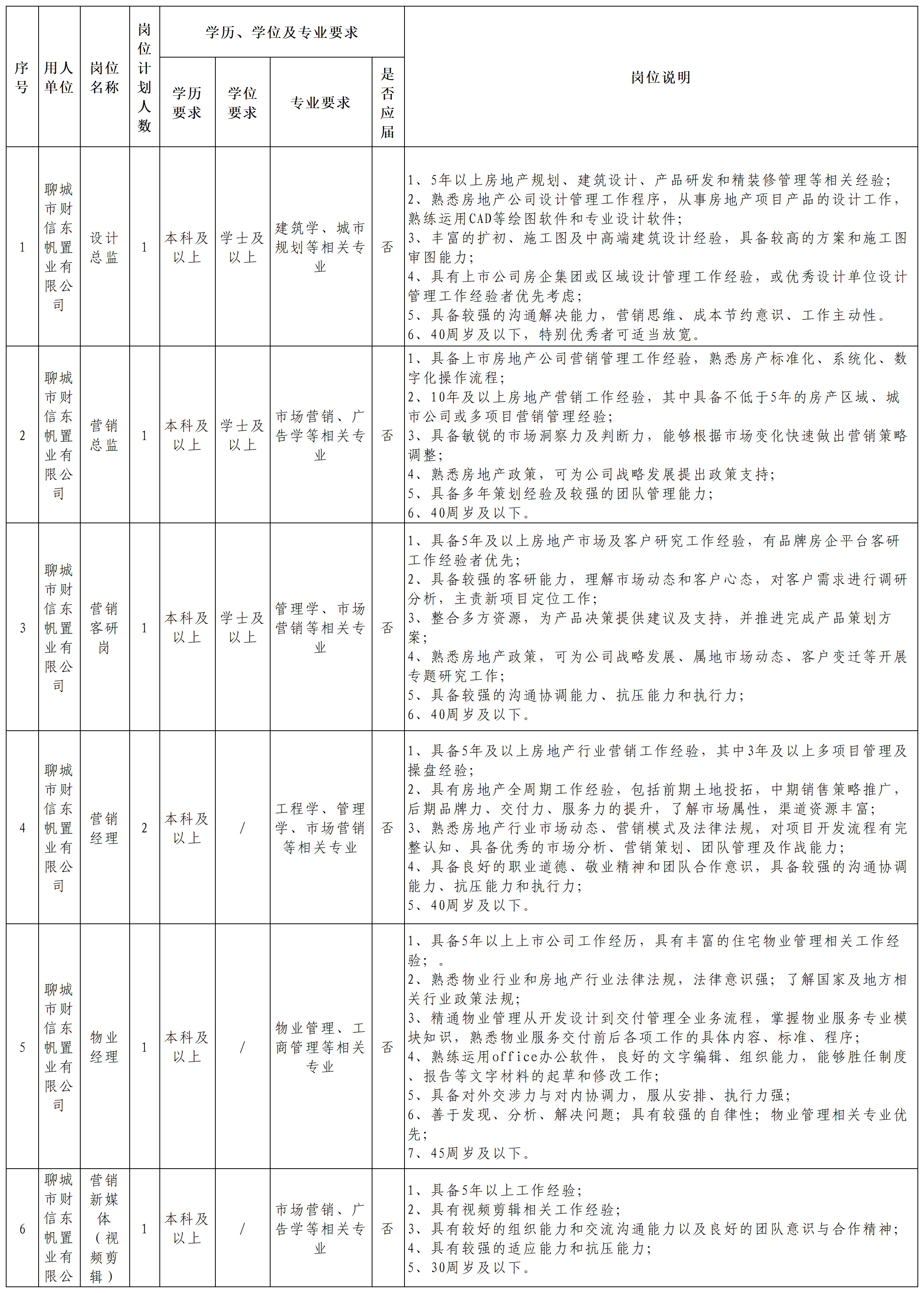 聊城市财信东帆置业有限公司(简称“东帆置业”),注册资本壹仟万,是隶属于聊城市财信城市发展有限公司的国有控股子公司,主营业务为房地产开发经营、各类工程建设活动、住宅室内装饰装修、非居住房地产租赁、市场营销策划等。现为满足公司发展和工作需要,特面向社会公开招聘优秀人才,现将招聘事项公告如下: