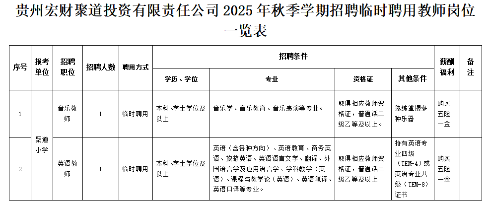 贵州宏财聚道投资有限责任公司2025年面向社会公开招聘临时聘用教师2名。具体招聘职位详见附件1《贵州宏财聚道投资有限责任公司2025年秋季学期招聘临时聘用教师职位一览表》(以下简称《职位一览表》)。