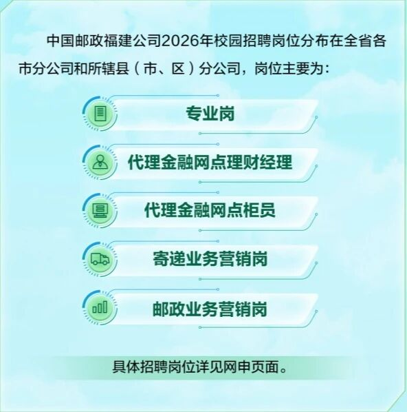 中国邮政集团有限公司三明市分公司2026年校园招聘岗位分布在所辖县(市、区)分公司,岗位主要为:专业岗、代理金融网点理财经理、代理金融网点柜员、寄递业务营销岗、邮政业务营销岗。
