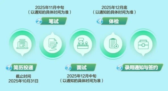 报名、简历筛选、笔试 (线上测评考试)面试、体检及后录用通知与签约。