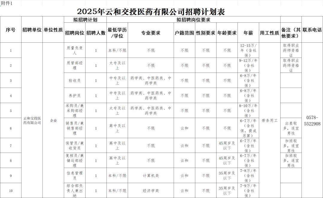 具体招聘单位、岗位、人数和报考资格条件等,详见附件1《2025年云和交投医药有限公司招聘计划表》,请登录本次招聘信息指定发布网站查询: