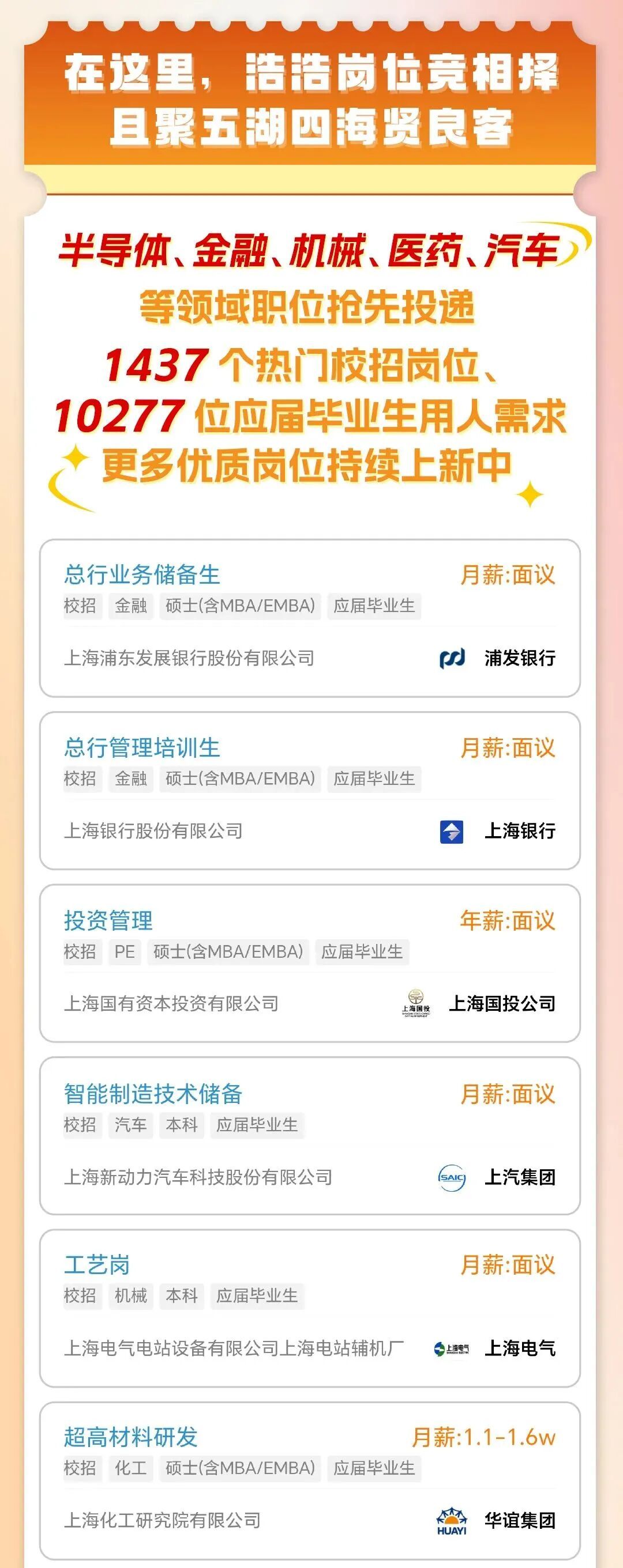 据市国资委介绍,“骐骥秋实”上海国资国企2026届高校毕业生校园招聘正式启动。本市地方国有企业提供1437个优质校招岗位、10277个应届生用人需求,欢迎2026届高校毕业生了解参与。详见;