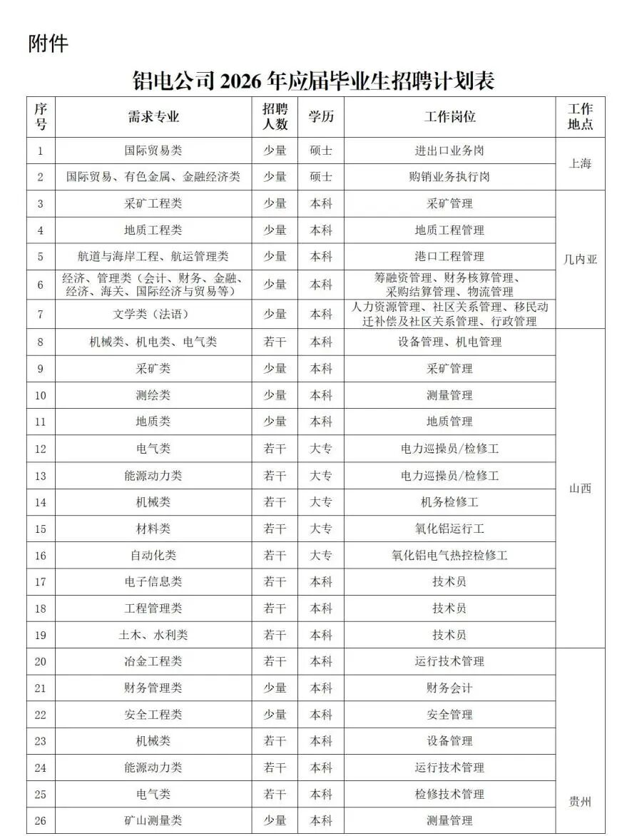附件:铝电公司2026年应届毕业生招聘计划表