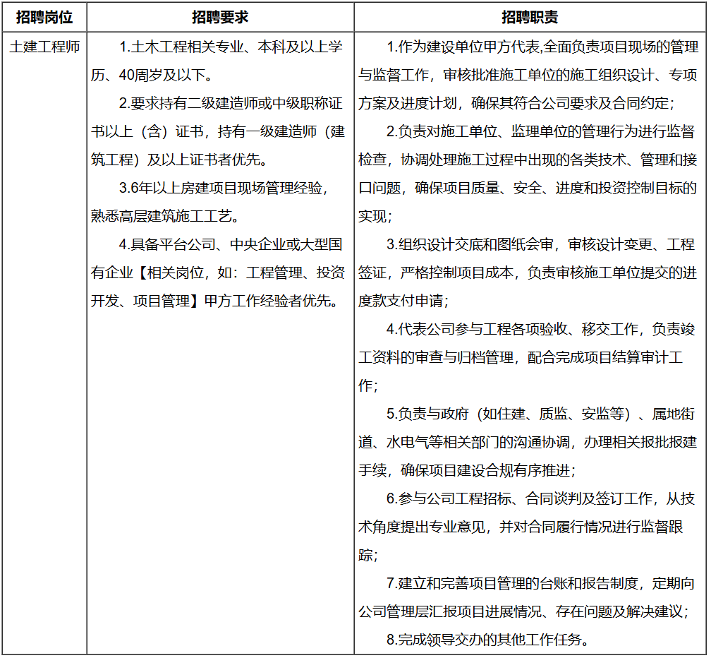 现面向社会公开招聘土建工程师2名,具体岗位信息如下: