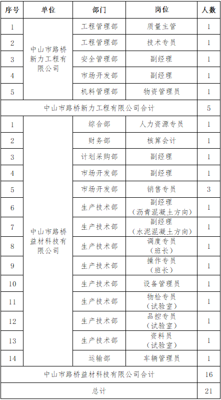 具体任职条件与岗位职责要求,详见《中山市路桥建设有限公司专业人才招聘岗位信息表》(附件1)。