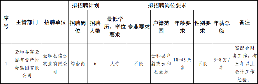 4.报名方式:采取现场报名,符合报考条件者须填写《云和县富云国有资产投资集团有限公司招聘劳务用工报名表》并粘贴近期免冠一寸照片一张(报名表自行下载)。