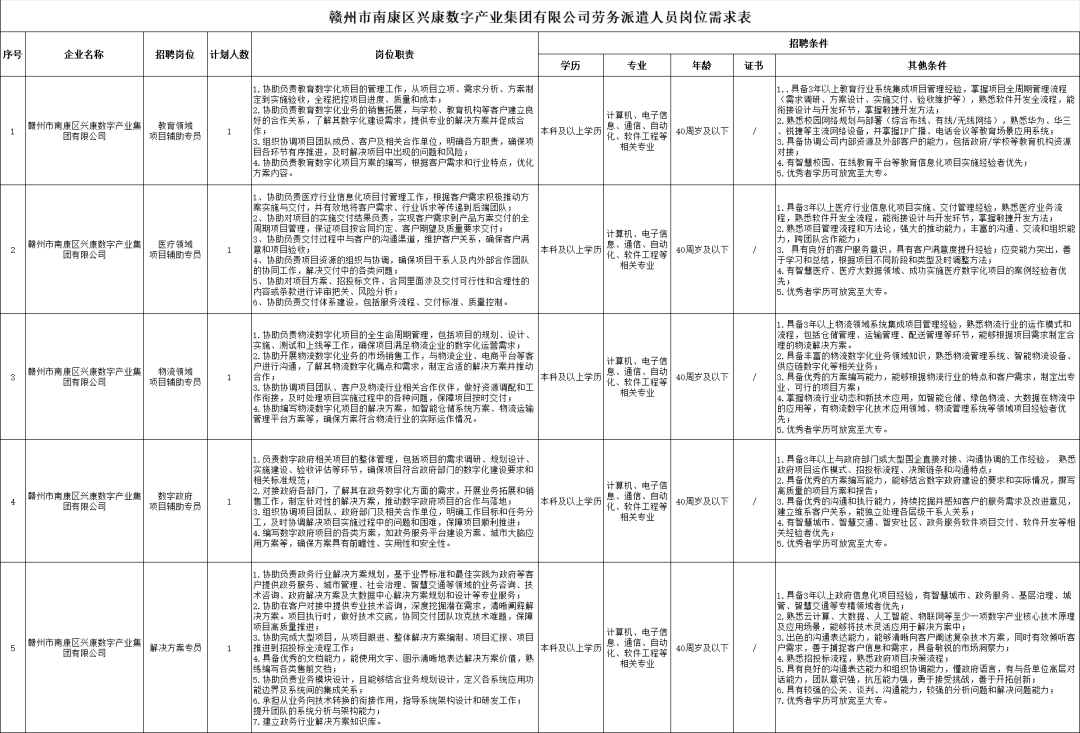赣州市南康区兴康数字产业集团有限公司教育领域项目辅助专员1人,医疗领域项目辅助专员1人,物流领域项目辅助专员1人,数字政府项目辅助专员1人,解决方案专员1人。