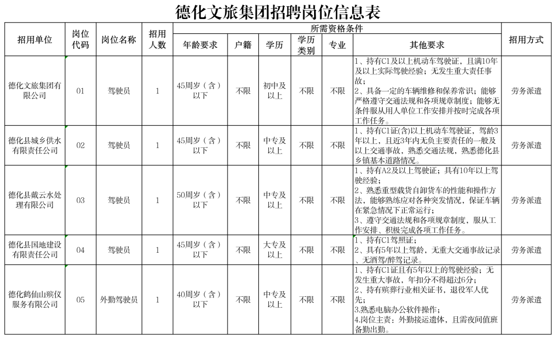 德化文旅集团有限公司于2019年9月注册成立,为具有独立法人资格的国有独资企业。主要从事陶瓷文化、旅游康养、水务发展、投资运营、民生服务五大板块业务,公司注册资本为5亿元,现有一级子公司18家,二级子公司10家,参股企业17家。现因工作需要,德化文旅集团有限公司及权属企业拟向社会公开招聘一批工作人员。具体公告如下: