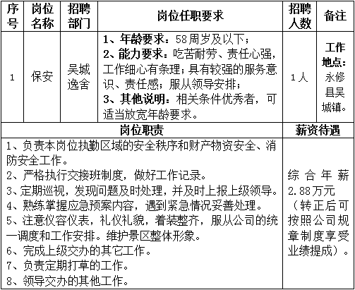 因永修吴城候鸟小镇旅游运营管理有限公司发展需要,决定面向社会公开招聘1名劳务派遣制工作人员,现将有关事项公告如下: