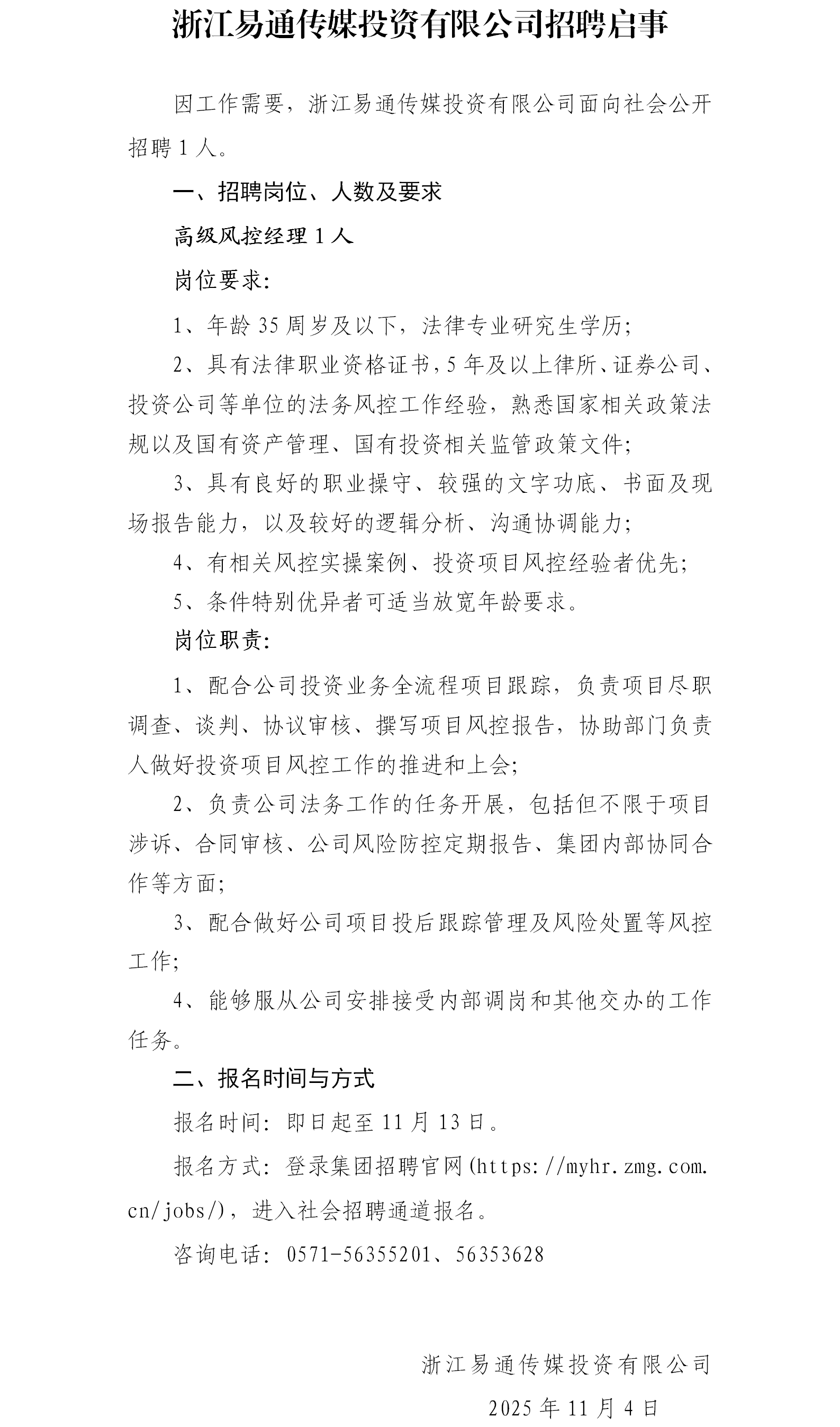 已结束 【合同制】浙江易通传媒投资有限公司招聘启事(招若干人,11月04日~11月19日报名)