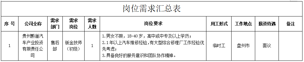 (三)用工地点:贵州黔道汽车产业投资有限责任公司