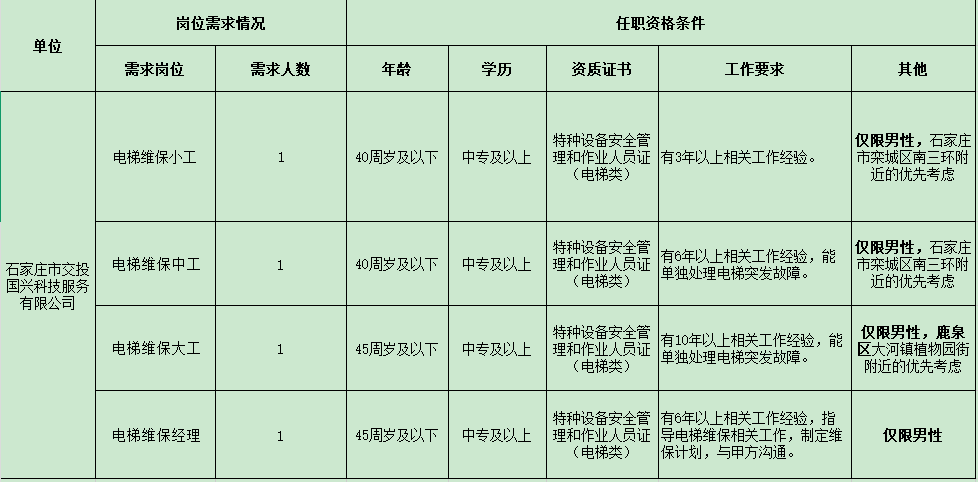 石家庄市交投国兴科技服务有限公司是石家庄市交投实业集团有限公司的全资子公司,隶属于交投集团,涵盖科技中介、酒店管理、餐饮管理特种设备安装改造修理、等各项专业服务。石家庄市永通物业服务有限公司是石家庄市交投国兴科技服务有限公司人力服务外包业务承接单位,现面向社会公开招聘外包人员,具体招聘事宜公告如下: