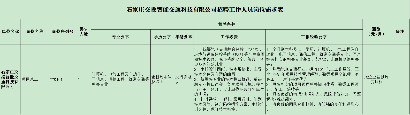 石家庄交投智能交通科技有限公司计划招聘工作人员1名,岗位信息见需求表。