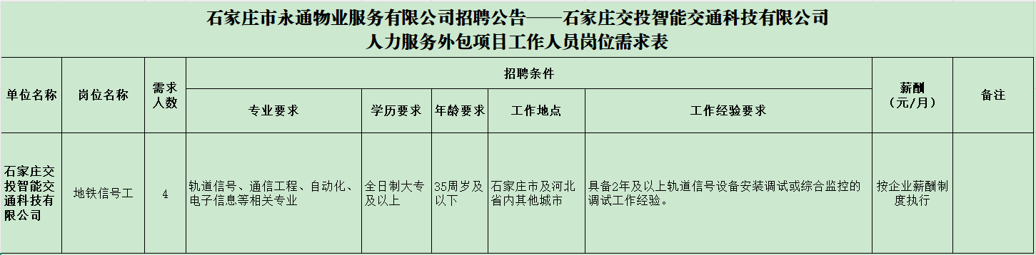石家庄交投智能交通科技有限公司涵盖技术研发、系统集成、运营维保,同时承接轨道交通、低空经济、高速公路和城市道路的智能化、信息化、机电、弱电等相关具体业务。目前,开展的业务主要涵盖轨道交通、低空经济、智慧交通三个板块。石家庄市永通物业服务有限公司是石家庄交投智能交通科技有限公司人力服务外包业务承接单位,现面向社会公开招聘外包人员,具体招聘事宜公告如下: