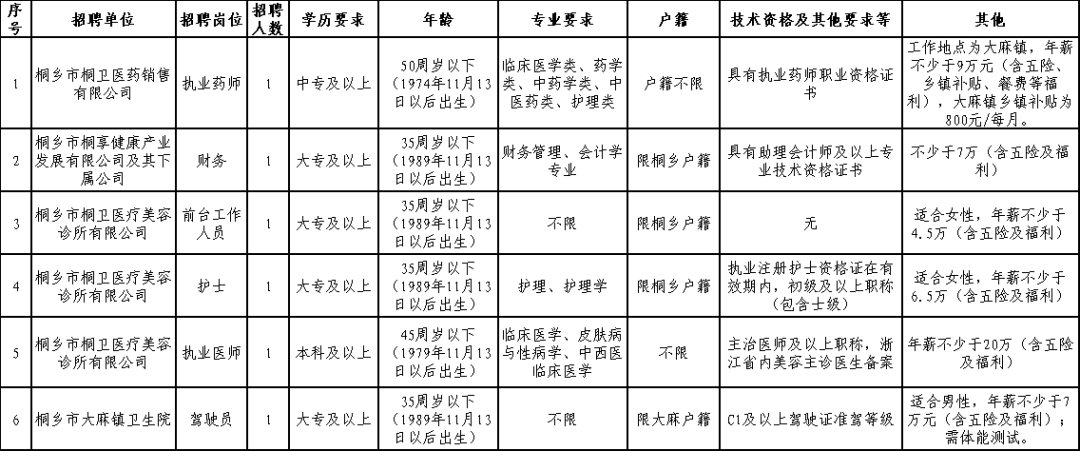 (一)基本条件1.有较好的思想政治素质,勤奋敬业,作风严谨,吃苦耐劳,品行端正、遵纪守法、勤奋好学、热爱本职工作。2.身体健康,无不良嗜好。3.有下列情形之一者不受理报名:①受过刑事处罚的;②处于党纪、政纪处分所规定的使用限制期内的;③涉嫌违纪违法正在接受有关专门机关审查尚未作出结论的;④其他不宜应聘的。(二)岗位条件1.执业药师岗位需中专及以上学历,临床医学类、药学类、中药学类、中医药类、护理类专业,50周岁以下(1974年11月13日以后出生),不限户籍,具有执业药师职业资格证书。工作地点为大麻镇,乡镇补贴为800元/每月。2.财务岗位需大专及以上学历,财务管理、会计(学)专业,35周岁以下(1989年11月13日以后出生),限桐乡户籍,具有助理会计师及以上专业技术资格证书。3.前台工作人员岗位需大专及以上学历,不限专业,35周岁以下(1989年11月13日以后出生),限桐乡户籍,适合女性。4.护士岗位需大专及以上学历,护理、护理学专业,35周岁以下(1989年11月13日以后出生),限桐乡户籍,适合女性,执业注册护士资格证在有效期内,初级及以上职称(包含士级)。5.执业医师岗位需本科及以上学历,临床医学、皮肤病与性病学、中西医临床医学专业,45周岁以下(1979年11月13日以后出生),不限户籍,主治医师及以上职称,浙江省内美容主诊医生备案。6.桐乡市大麻镇卫生院驾驶员岗位需大专及以上学历,不限专业,35周岁以下(1989年11月13日以后出生),C1及以上驾驶证准驾等级,限大麻镇户籍,适合男性。