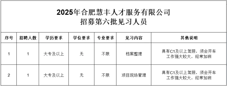 为切实做好高校毕业生等青年群体就业见习工作,充分发挥国有企业在稳就业工作中的引领示范作用,现就合肥慧丰人才服务有限公司 2025 年公开招募第六批见习人员,有关事项公告如下: