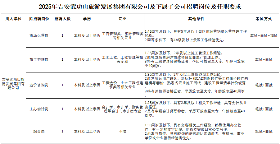 详见附件1《2025年吉安武功山旅游发展集团有限公司及下属子公司招聘岗位及任职要求》。本次招聘岗位年龄计算方法为:30周岁及以下是指1994年11月15日(含)以后出生,其他年龄计算方式依此类推。此年龄计算方法适用于本次考试的报名、考试、体检、考察、公示、聘用等所有环节。招聘岗位要求的毕业证书或资格证书获取的时间截至2025年11月15日(含)。