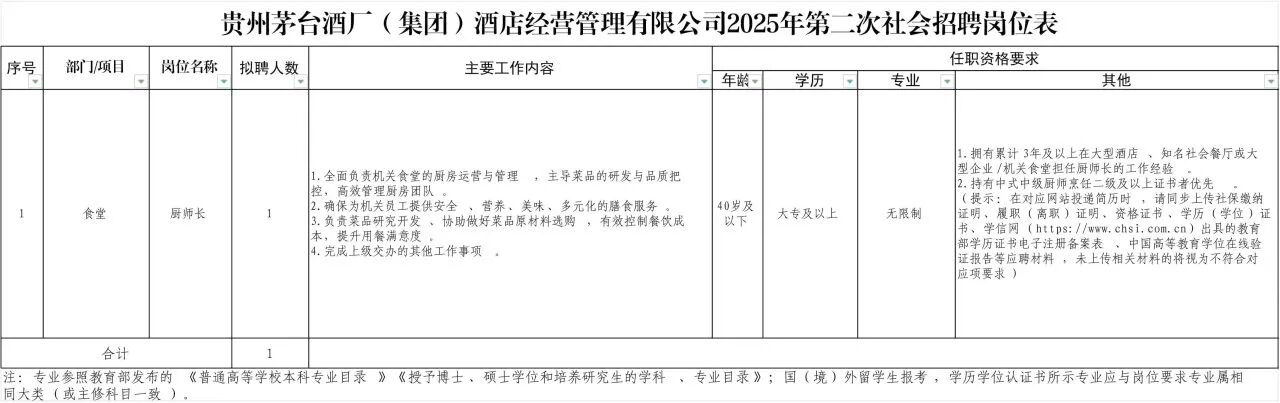 标签: 贵州茅台酒厂(集团)酒店经营管理有限公司 2025年第二次社会招聘 招聘公告 茅台集团酒店管理 贵州茅台招聘 酒店行业招聘 酒厂招聘