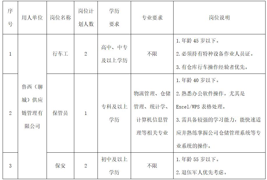 鲁西(聊城)供应链管理有限公司为聊城金投控股有限公司旗下重要业务板块,2021年4月启动运营,公司聚焦聊城钢管、钢板产业,推出项目主材供应、大宗物资贸易及监管仓服务,并创新打造“智慧云工厂”平台,为满足公司发展和工作需要,现委托聊城市鲁西人力资源开发有限公司面向社会公开招聘劳务外包人员,现将招聘事项公告如下: