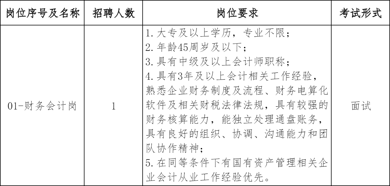 永丰县国丰资产营运有限公司(简称:国丰公司)成立于2009年10月16日,是永丰县城市建设投资开发有限公司和中国农发重点建设基金有限公司共同出资的有限责任公司(国有控股),由永丰县机关事务中心实管,县城发集团虚管并表子公司。经营范围包含:国有资产经营管理、资本经营与投资、城镇化建设、城市基础设施建设、房屋建筑、餐饮服务等。根据公司业务发展需要,经公司研究,决定面向社会公开招聘1名工作人员。现将有关事项公告如下: