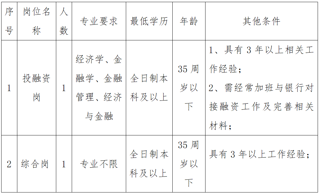 余干县发展控股集团有限公司(县政府直属企业),因工作需要,需面向社会公开招聘2名工作人员:投融资岗1人, 综合岗1人。现就有关事项公告如下。