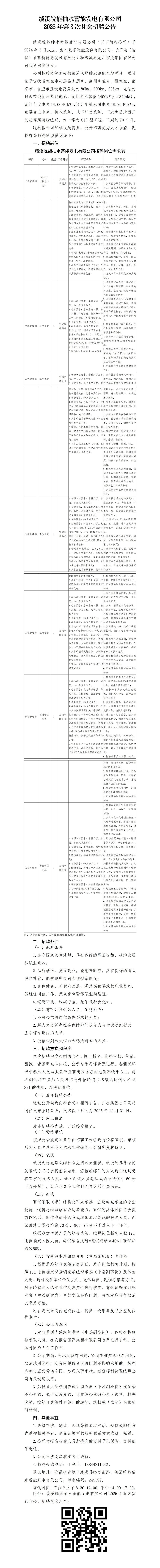 已结束 【合同制】绩溪皖能抽水蓄能发电有限公司2025年第3次社会招聘公告(招若干人,12月11日~12月26日报名)