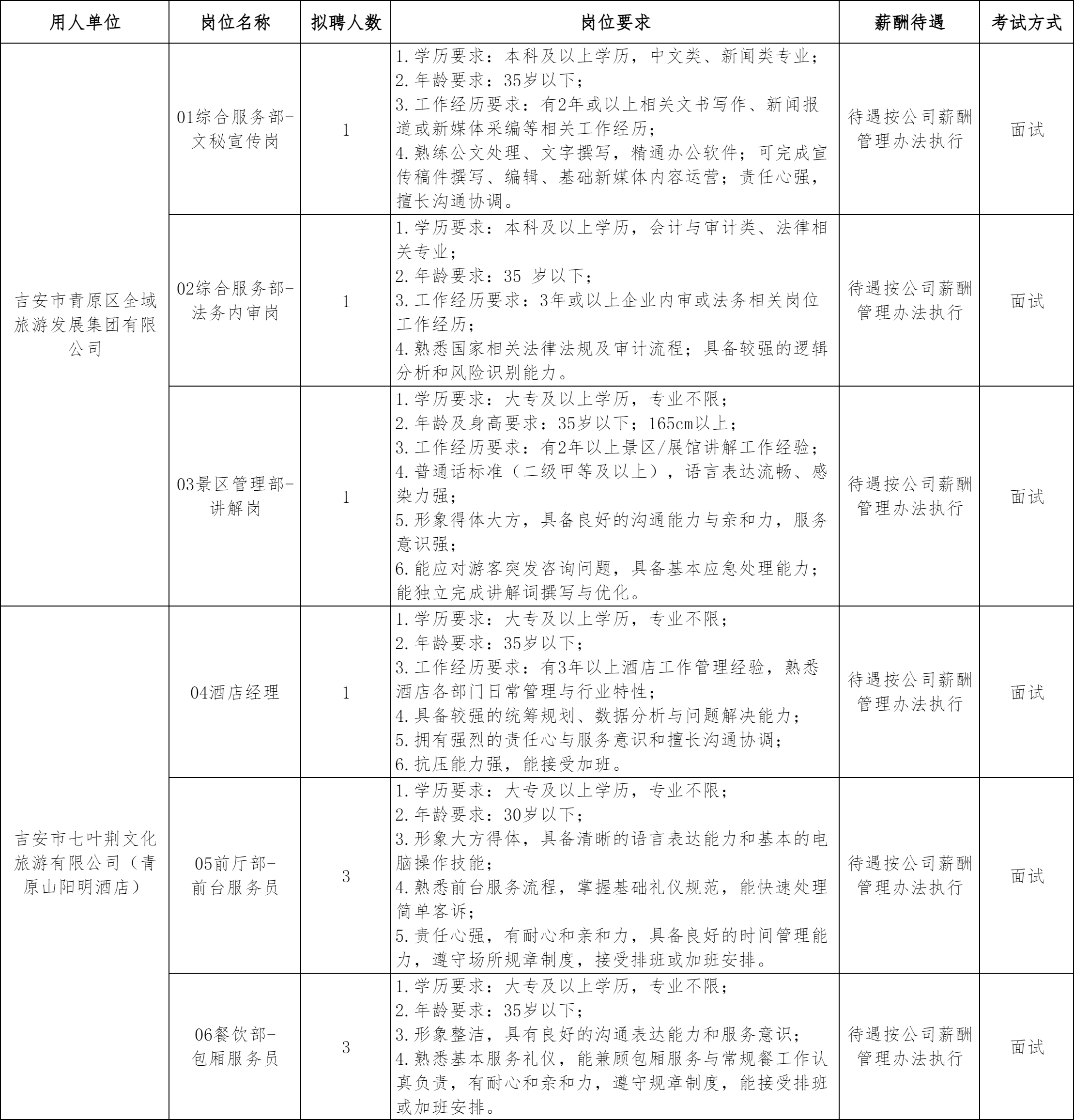 吉安市青原区全域旅游发展集团有限公司是一家从事商业旅游开发的国有企业。根据工作需要,吉安市青原区全域旅游发展集团有限公司及下属子公司吉安市七叶荆文化旅游有限公司(青原山阳明酒店)决定面向社会公开招聘10名聘用制工作人员。现将有关事项公告如下: