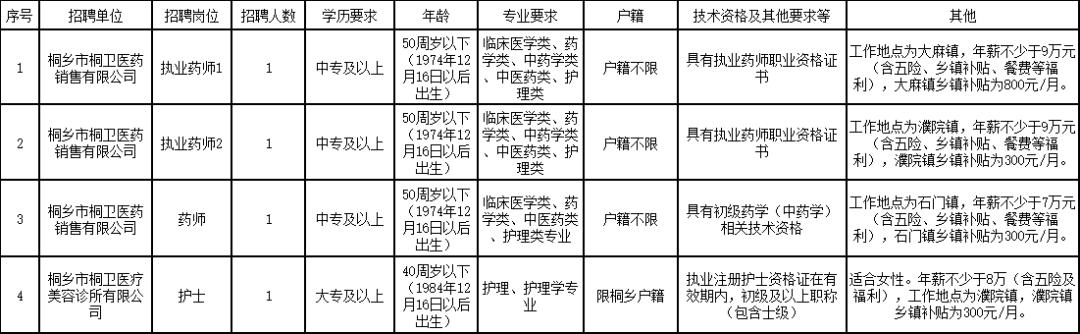 1.有较好的思想政治素质,勤奋敬业,作风严谨,吃苦耐劳,品行端正、遵纪守法、勤奋好学、热爱本职工作。3.有下列情形之一者不受理报名:①受过刑事处罚的;②处于党纪、政务处分所规定的使用限制期内的;③涉嫌违纪违法正在接受有关专门机关审查尚未作出结论的;④其他不宜应聘的。1.执业药师1岗位需中专及以上学历,临床医学类、药学类、中药学类、中医药类、护理类专业,50周岁以下(1974年12月16日以后出生),不限户籍,具有执业药师职业资格证书。工作地点为大麻镇,大麻镇乡镇补贴为800元/月。2.执业药师2岗位需中专及以上学历,临床医学类、药学类、中药学类、中医药类、护理类专业,50周岁以下(1974年12月16日以后出生),不限户籍,具有执业药师职业资格证书。工作地点为濮院镇,濮院镇乡镇补贴为300元/月。3.药师岗位需中专及以上学历,临床医学类、药学类、中医药类、护理类专业,50周岁以下(1974年12月16日以后出生),不限户籍,具有初级药学(中药学)相关技术资格。工作地点为石门镇,石门镇乡镇补贴为300元/月。4.护士岗位需大专及以上学历,护理、护理学专业,40周岁以下(1984年12月16日以后出生),限桐乡户籍,适合女性。执业注册护士资格证在有效期内,初级及以上职称(包含士级)。工作地点为濮院镇,濮院镇乡镇补贴为300元/月。本次招聘工作贯彻公开、平等、竞争、择优的原则,坚持德才兼备的用人标准,按照发布招聘公告、报名、资格审查、考试、体检、考察、公示、聘用等程序进行。报名时间:2025年12月17日-2025年12月23日16时。报名网址:https://zky.ninghangyun.com/#/custom/detail?planId=1ec917c685c4435492cbe85fc534a1bf报考人员需按职位要求和网上报名系统提示,如实、准确、完整地填写有关信息,并提前准备报名需上传系统的:①报名表;②一寸电子照片;③有效期内的第二代居民身份证(正反);④学历证书;⑤有户籍要求的需上传户口本户主页及本人页;⑥岗位要求的其他有关证书等。仅注册不报岗位,视为无效报名。机关、事业单位、国有企业在编或在岗人员应聘的,报名时须上传单位同意报考证明。网上报名资格审查时间:2025年12月17日-2025年12月23日17时。通过初审的考生需携带报名时提交的资料原件及复印件参加资格复审:①报名表;②有效期内的第二代居民身份证(正反);③学历证书;④岗位要求的其他有关证书等。资格复审时间:2025年12月29日中午12:30-13:30。资格复审地点:桐乡市梧桐街道凤鸣路81号,桐乡市桐享健康产业发展有限公司七楼会议室。若同一岗位通过资格审查的报名人数未超过招聘计划1:8,则直接进入面试。超过招聘计划1:8的,则采取面谈+面试的方式。先进行面谈,面谈满分100分,合格分数线60分,未达到合格分数线的不进入面试环节。根据面谈成绩,从高分到低分按招聘计划1:3的比例确定入围面试对象。面谈成绩仅作为是否进入面试依据,不计入总成绩。面试工作由桐乡市桐卫人力资源服务有限公司组织实施。面试成绩满分为100分,合格分为60分;面试分数相同的,启封备用试卷进行加试,加试成绩高者优先;面试不合格者,不能列入体检、考察人选。面试地点:桐乡市梧桐街道凤鸣路81号,桐乡市桐享健康产业发展有限公司七楼会议室。面试后,根据面试成绩从高分到低分按招聘计划的1∶1比例确定体检、考察人员。体检项目和标准按《公务员录用体检通用标准(试行)》、《公务员录用体检特殊标准(试行)》及操作手册执行。报考人员不按规定的时间、地点参加体检,视作放弃体检。体检费用自理。放弃体检或体检不合格的,按总成绩依次递补(未参加面试和面试不合格的人员不得递补)。考察由桐卫人力资源服务有限公司组织实施。考察对象所在单位应当积极支持和配合考察组工作,客观真实地反映考察对象的实际情况。放弃考察或考察不合格的,可从面试合格人员中依次递补。根据体检、考察结果,确定拟聘用人员名单,在“桐享健康”公众号公示5个工作日。公示期满后,对没有反映问题或反映有问题经查实不影响聘用的,予以聘用。对反映有影响聘用问题并查有实据的,不予聘用;对反映的问题一时难以查实的,将暂缓聘用,待查清后再决定是否聘用。拟聘用人员须在规定的时间内办理报到手续,无正当理由逾期不报到的,视作自动放弃。聘用后与桐乡市桐卫人力资源服务有限公司签订劳务派遣合同,并实行试用期制度,试用期满后经考核不合格的解除劳动合同。本公告未尽事项,由桐乡市桐卫人力资源服务有限公司负责解释。桐乡市桐卫人力资源服务有限公司招聘劳务派遣人员岗位需求表.docx报名表.docx