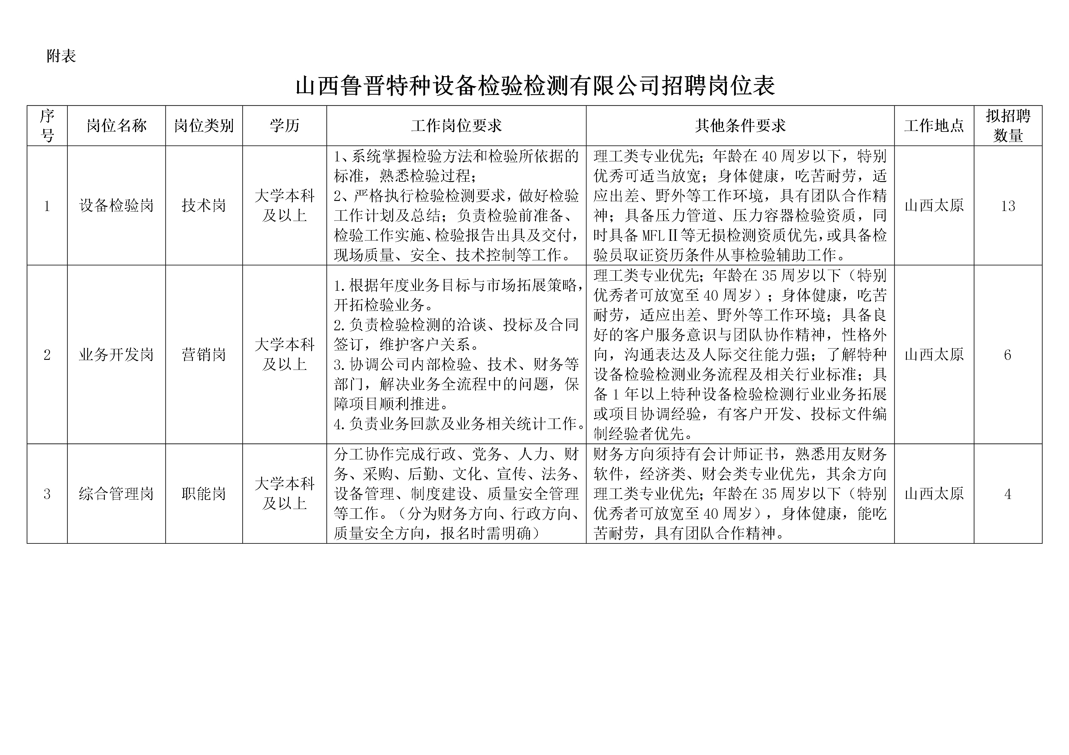 2.资格审查。对应聘人员的资格审查工作,贯穿招聘工作的全过程。进入面试的报考人员,需在规定的时间,按招聘简章及岗位要求,向用人单位提交《山西鲁晋特种设备检验检测有限公司招聘工作人员报名登记表》(附件)、身份证、本人学历相关证明材料、个人相关资质证明材料(原件及复印件,复印件由审核单位留存)。