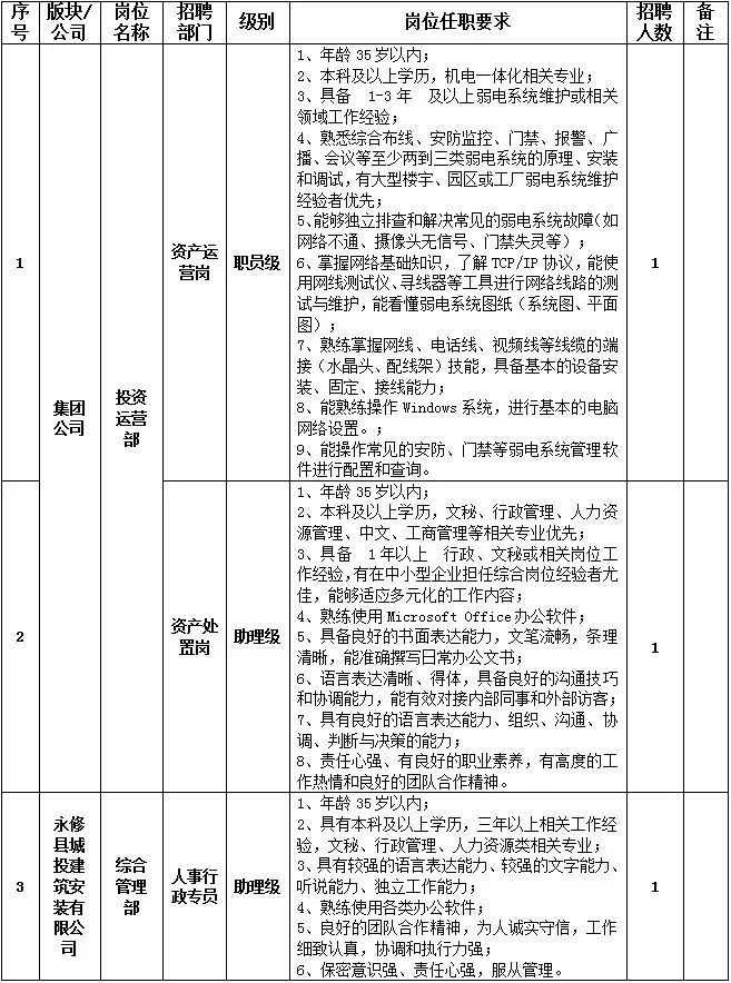 江西赣江新区永修投资集团有限公司是经永修县人民政府批准和授权的政府投资主体和国有资产经营主体,是具有法人地位的国有独资公司。公司以基础设施、农业产业、旅游等产业项目的投资与开发为主导,以金融、房地产、工业地产等多元化投资为补充,不断加快改革发展步伐。因集团公司发展需要,特面向社会公开招聘工作人员3名,现将有关事项公告如下: