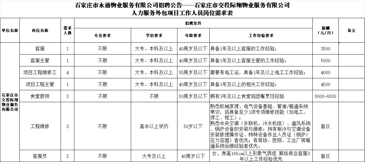 2、本次公开招聘外包人员工作由石家庄永通物业服务有限公司统一组织实施。