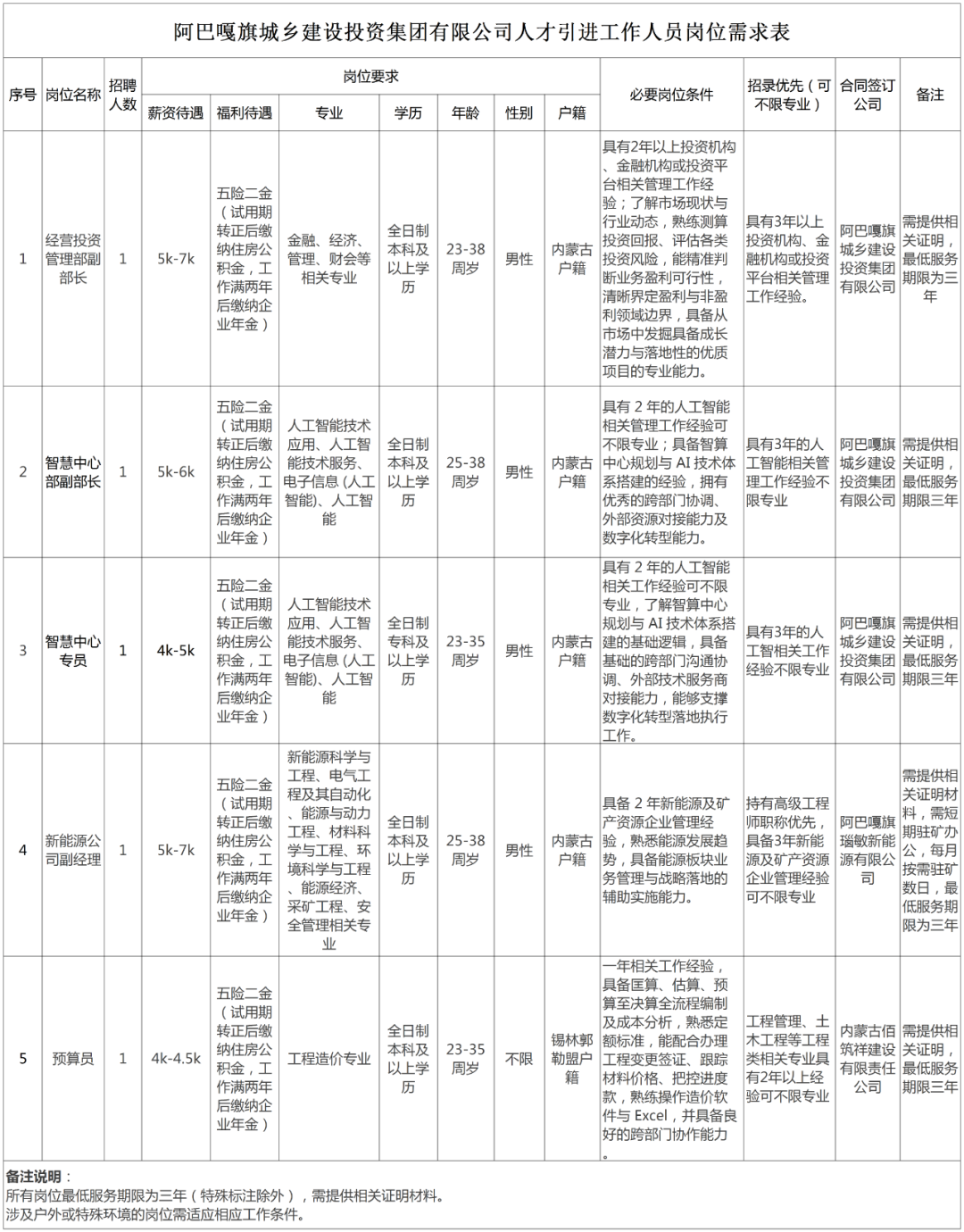 (一)本次面向社会公开招聘工作人员5人。具体招聘计划详见附件1:《阿巴嘎旗城乡建设投资集团有限公司人才引进工作人员岗位表》