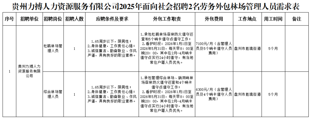 贵州力搏人力资源服务有限公司成立于2015年,注册资金7000万元。公司经营范围:人力资源供求信息收集、整理、储存、发布和咨询;职业介绍、职业指导、人事代理;职业技能认定;涉密档案数字化加工;受用人单位委托代办人员招聘;人员求职及能力提升培训、人才测评和人才价值评估;受用人单位委托提供人力资源管理服务;人力资源信息网络服务;国内劳务派遣;信息发布;就业信息咨询服务;劳务培训;举办招聘会;企业管理咨询;接受委托提供劳务服务;劳动事务保障代理;会展服务;组织文化艺术交流活动(不含演出);家庭劳务服务。根据工作需要,贵州力搏人力资源服务有限公司2025年面向社会招聘2名劳务外包林场管理人员,招聘要求详见附件1;(一)有违法犯罪记录或违法犯罪嫌疑尚未查清的人员;(五)参与邪教、非法宗教组织及其活动,无正当理由组织或参加或信访的;(六)不符合招聘对象、报名条件或岗位所需资格条件的。有违法犯罪记录或违法犯罪嫌疑尚未查清的人员。 杜鹃林场7100元/月;综合林场6300元/月;详见附件1在贵州力搏人力资源服务有限公司微信公众号公开发布招聘公告,公告时间从2025年12月26至2025年12月29日。2.报名时间:2025年12月26日至2025年12月29日下午17:00;3.注意事项:报名人员根据所报岗位要求,所填信息及照片核对无误后,提交的报名申请材料应当真实、准确、完整。报名人员因身份证过期、信息填写失误、照片模糊变形、未按时提交报名信息等原因,导致报名审核未通过或后续招聘过程中出现无法通过资格审查等问题的,后果由报名人员本人承担。报名人员故意隐瞒本人重要信息或提供虚假报名申请材料的,一经查实,立即取消资格;5.资格审查:资格审查由招聘工作小组统一组织实施。资格审查负责人员根据报名人员填写的信息,对照《招聘方案》和招聘岗位所需的资格条件进行资格审查。根据报名审核通过人员确定参加面试对象。1.面试由贵州力搏人力资源服务有限公司组织实施。2.面试成绩未达到85分及以上,不予录用。3.面试主要考察应聘岗位综合素质与能力。4.面试采取现场打分方式,满分100分。5.面试时间、地点(请关注贵州力搏人力资源服务有限公司微信公众号)。6.未参加面试或未取得有效成绩的应聘人员取消进入下一环节的资格。面试结束后即进入体检环节。面试结束后根据应聘人员成绩由高到低按单个岗位招聘计划人数与该岗位参加体检人数1:1的比例确定体检对象。放弃体检或体检不合格的,取消进入下一环节资格,空缺岗位按面试成绩从高到低依次进行递补。体检在县级及以上医院进行,体检费用由应聘人员自理。体检具体时间(请关注贵州力搏人力资源服务有限公司微信公众号)。经面试、体检合格的应聘人员,确定为拟聘用人员,由贵州力搏人力资源服务有限公司微信公众号公示拟聘用人员名单。公示时间不少于3个工作日,接受社会监督。公示期间查实有严重问题影响聘用的,取消聘用资格,一时难以查实的,暂缓聘用,待查实并做出结论后再决定是否聘用。 对公示期满无异议或反映的问题经调查核实后不影响录用的,按规定办理审批及聘用手续。被聘用人员应在规定时间到公司报到。无正当理由不按规定时间内报到的,解除聘用关系。附件1:贵州力搏人力资源服务有限公司2025年面向社会招聘2名劳务外包林场管理人员岗位需求表