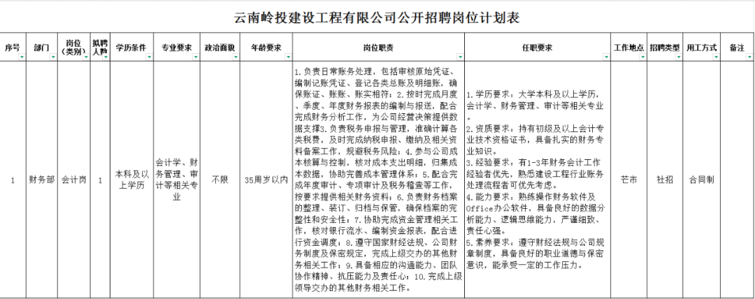 附件:1.云南岭投建设工程有限公司公开招聘岗位计划表