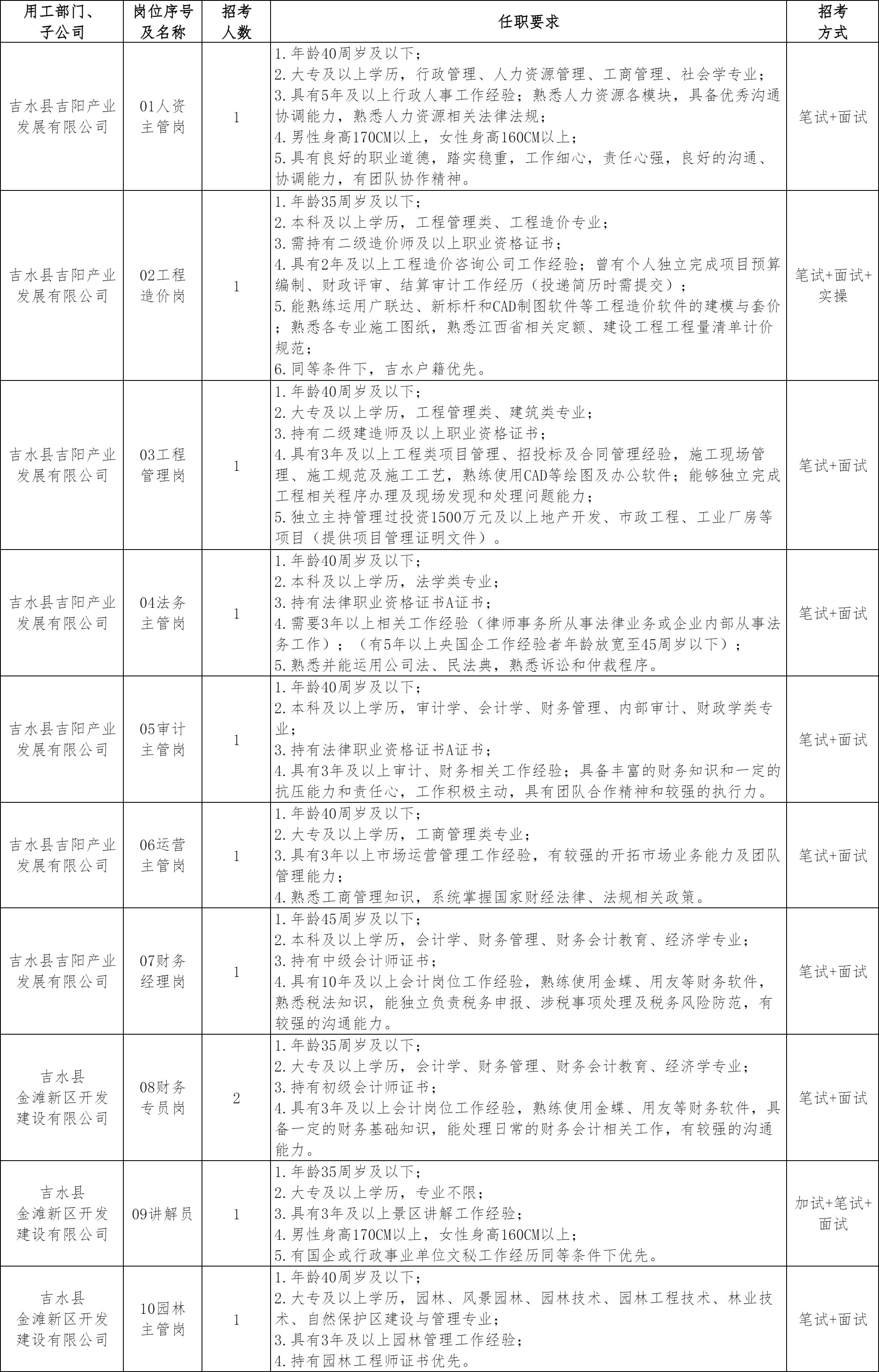 吉水县吉阳产业发展有限公司是吉水县人民政府批准成立的一家国有企业,公司主营业务包括工程管理服务,环境保护专用设备制造,餐饮管理等。因工作需要,吉水县吉阳产业发展有限公司及下属子公司经研究决定面向社会公开招聘11名工作人员。现将有关事项公告如下: