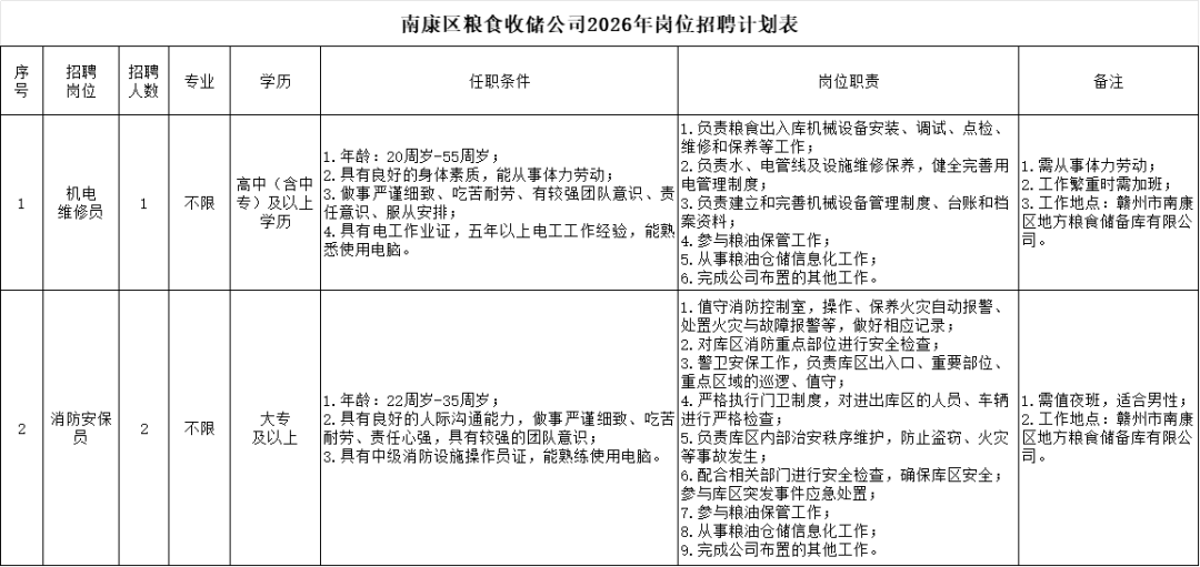 因工作需要,赣州市南康区粮食收储公司面向社会公开招聘机电维修员1名、消防安保人员2名,现将招聘有关事项公告如下: